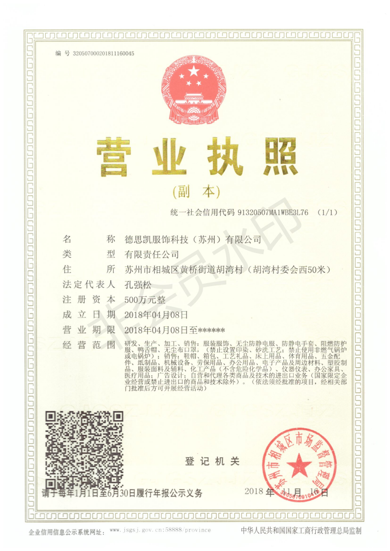 德思凱服飾科技(蘇州)有限公司系蘇州零點職業服裝廠(2006年注冊)原股東于2018年4月份注冊成立,主營業務是阿里巴巴國際站和績優外企的服裝服飾定制業務。本公司是一家集設計、生產、銷售于一體的生產型企業,專業從事各種工作服、職業裝、休閑服飾的設計與生產。公司匯集了從業數十年經驗的服裝設計師和優秀的管理人才,把“誠信立足天下,品質引領未來”作為企業的指導思想和行為準則,力爭為客戶體現獨有的企業文化。